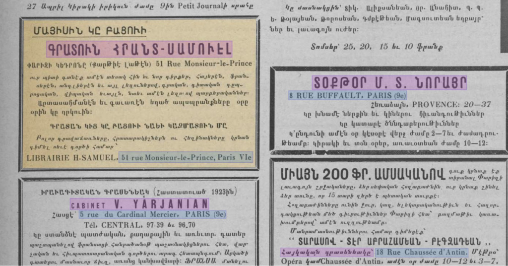 The MAP project (Mapping Armenian Paris) offers an original approach to using collections of Armenian newspapers published in France at the beginning of the 20th century: creating a map of the commercial and industrial activity of the Armenian diaspora in Paris, through the recognition and analysis of advertisements in newspaper collections using artificial intelligence.